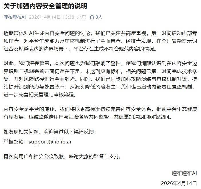 4月14日,哩布哩布AI发布关于加强内容安全管理的说明。